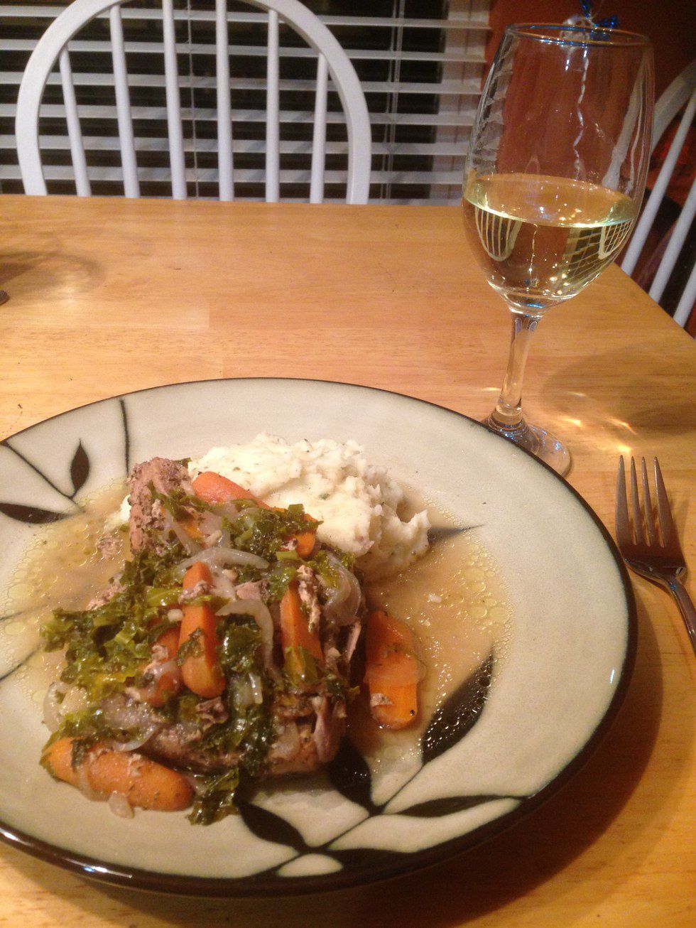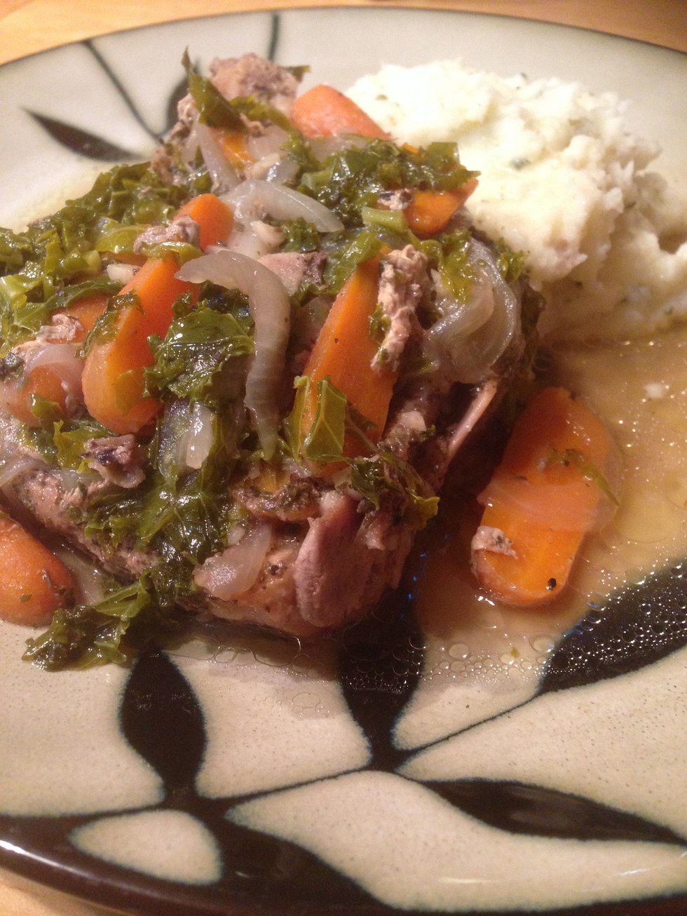 8. Uncover pork chops and add kale. Bake for another 10 minutes or until kale has slightly wilted. Add salt and pepper to taste. Serve with rice or potatoes.