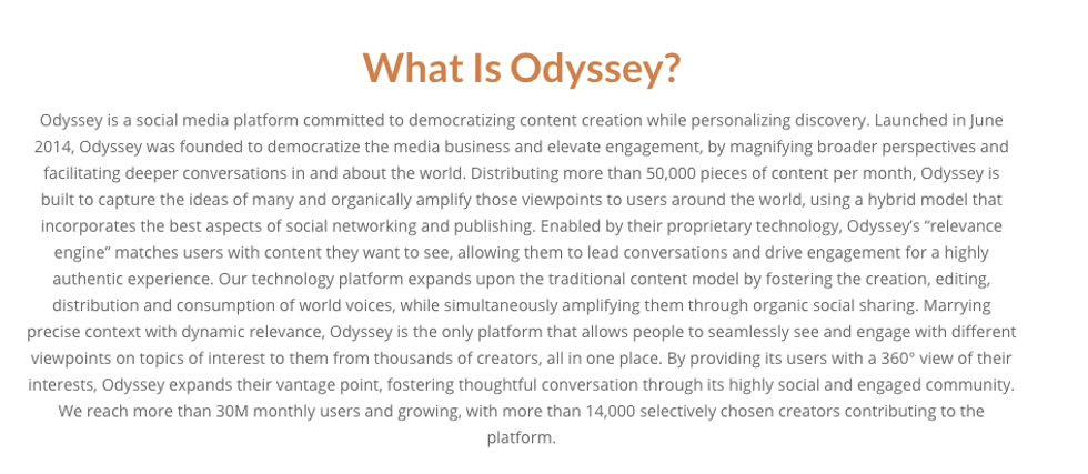 Odyssey claims to have rebranded itself as a social networking site. And yet, the focus is entirely on sharing content to other sites in hopes of garnering public attention. This offers little support to help aid the writing process, such as lessons on citations, permalinks, leads, or sourcing photos. The business model of Odyssey is solely based on gaining views, not producing good content.