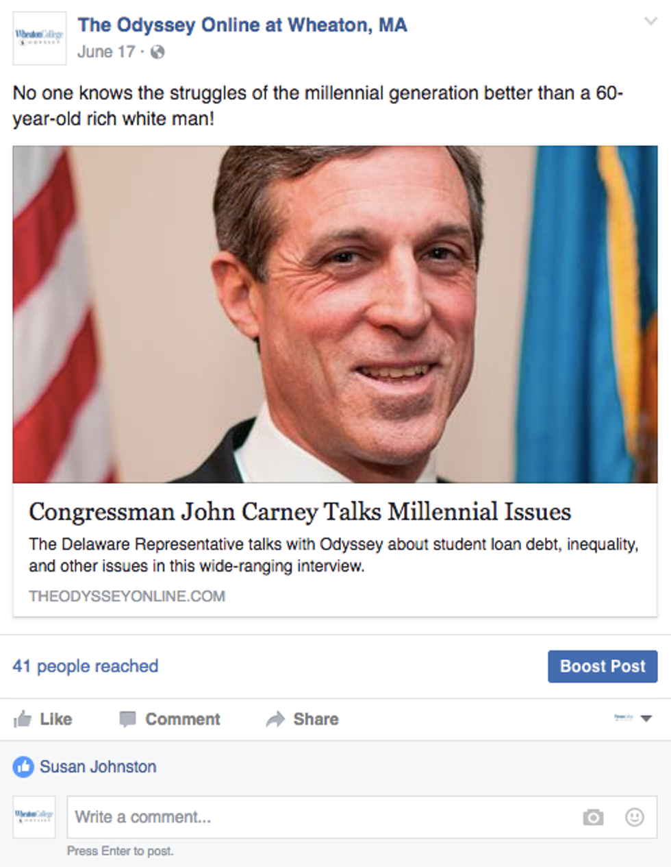 Most other media outlets pay you as a writer upon acceptance or upon publication. Odyssey thrives on what is described in another article as free labor. Because Odyssey is so unselective with their material, they cannot afford to pay all those who build up the brand, but only those that they choose to endorse. Because Wheaton no longer has a page set up to distribute our content to our community, it is harder to get the attention or traffic to the people who would theoretically enjoy it the most: our college peers.
