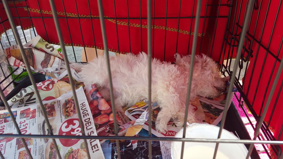 A little thrown off by that first vendor, we knew we had more to look for, as there was no way that was what the accusations were about. As we circled around to another line of tents, our hearts were immediately broken as we came across a tent with cages propped up on plastic tables with dogs lying in the heat with dirty water and no food. These cages were small, except for one larger one which actually held two medium-sized young dogs. All of them were just put on top of newspaper, and there were blankets over top of the cages. The dogs honestly looked dead as they lied there, unmoving and inattentive.