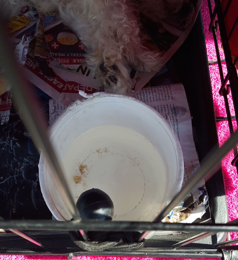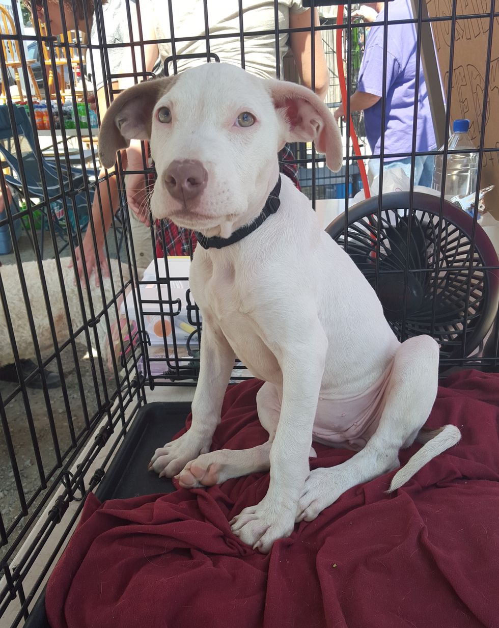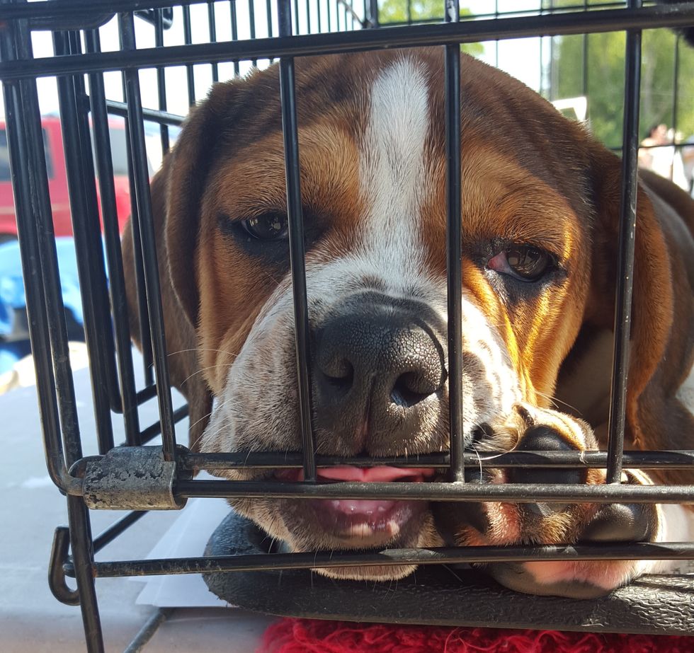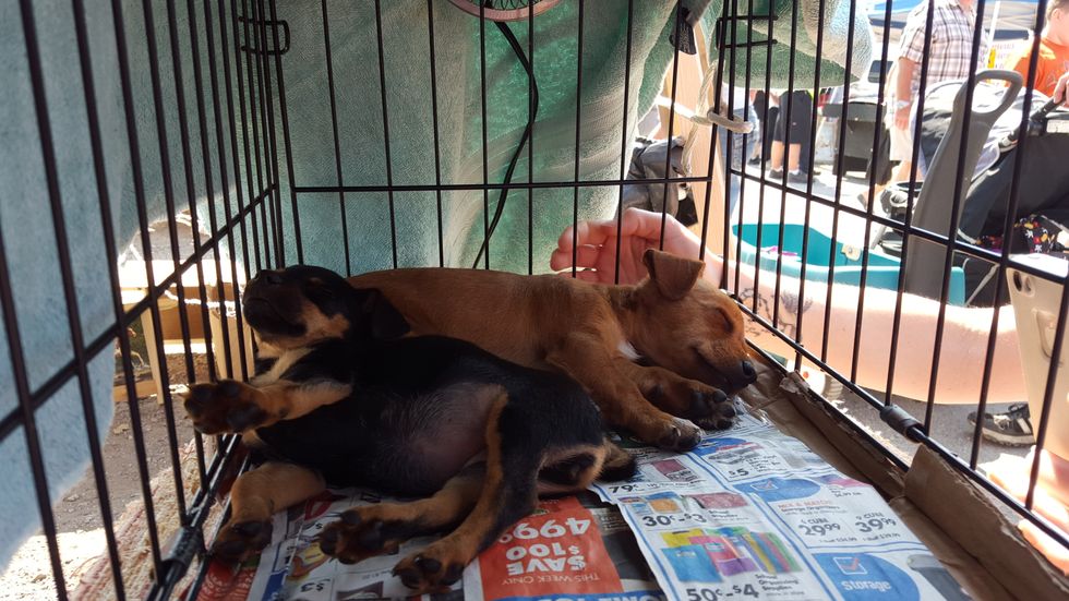 Often they would be digging under the newspaper to find a couple bits of kibble to eat. The lady who was one of the vendors at that tent sprayed the dogs down with a solid stream of water from a spray bottle. Let it be known that this does not cool dogs down, and the stream should have been a fan spray, not a jet. Those two dogs were soon let out, as one family held the boxer/beagle mix, and I held the lab. Both seemed calm and happy to be out of the cage.