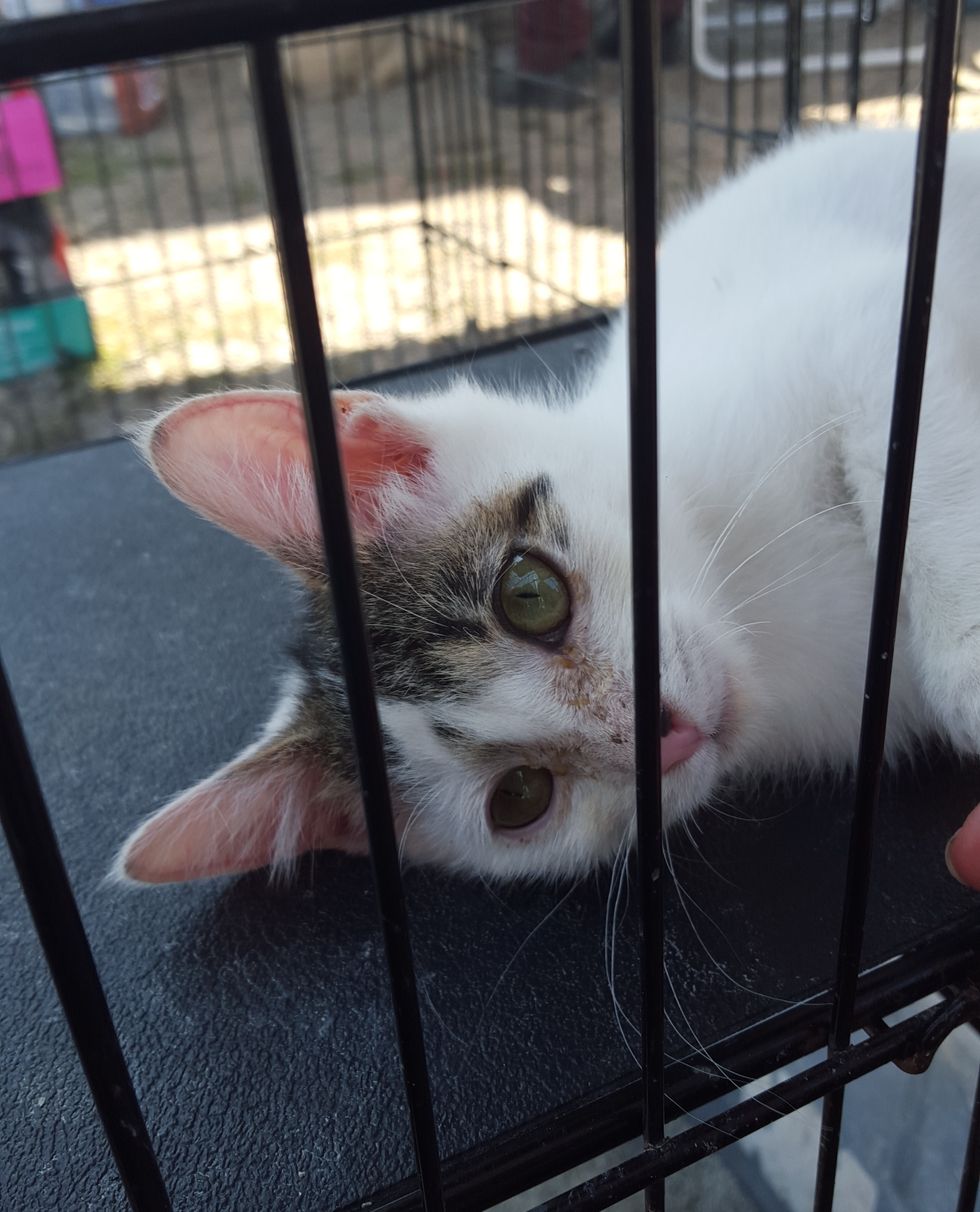 We first saw the large, multi-level cage housing three kittens. There were toys hanging from the rungs and fans directed down onto the cats.