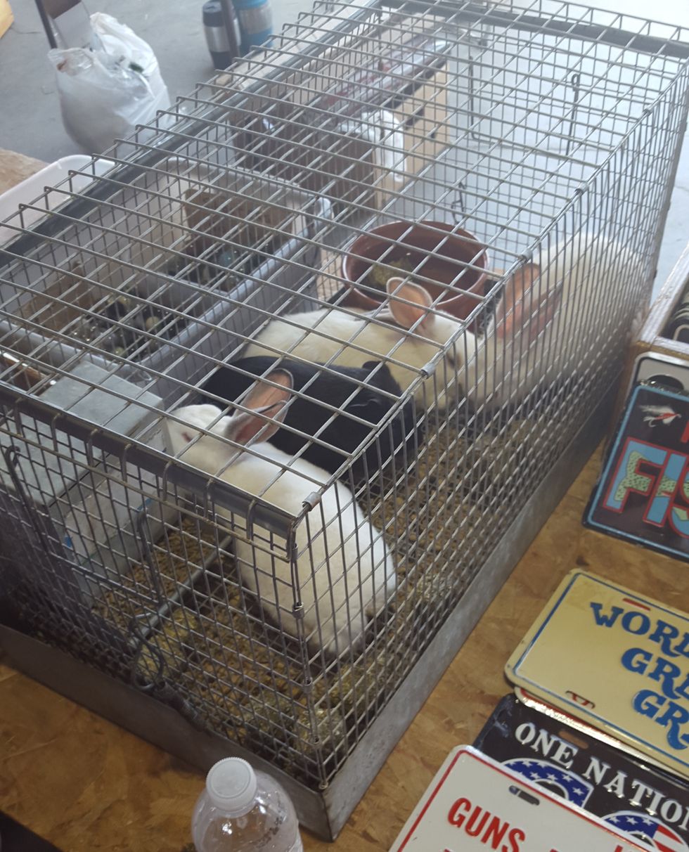 We searched for the truck of dogs, yet did not find one. As we retreated back towards the rescue tent, Destiny pointed out a truck in the field with a cage on it. As we headed towards it, we realized it may have been the worst we came across all day. A family, parents and three little kids, were set up out of the back of their truck with two other tables, selling bunnies, hamsters, and a lamb. The adult bunnies and hamsters, kept in cages and meat crates were being sold for only $5 a pop. All of these animals were being held in the blazing sun, with no cover and no fans. The father was sitting atop a stack of meat crates full of bunnies. Jody paid for Destiny to buy one of their bunnies because she saw it was blind, and when asked if they still wanted $5 for the blind bunny, the man said, "Yeah, because actually I've got another way I can go with it, but I won't say which way it is..." and then laughed. I've never felt more disgusted in my life than by him making a joke out of killing a blind rabbit.