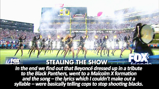 Now let's break down the "controversial" attributes of this whole thing. At the beginning of the performance, Beyonce and her dancers (dressed as Black Panthers) got into an X formation, which led people to believe that this was supposed to resemble the X in "Malcolm X," a famous figure in the civil rights movement of the mid to late 1960s who believed violence was necessary to present the message of black people's anger at the injustice and racism towards our race. While this may be true, it is not at all bad to honor a part of black history. As violent and scary as Malcolm X's tactics were, he truly was a huge part in the civil rights movement. This may seem like I am justifying violence, but this is really justifying people whose voices are constantly ignored and pushed to the side. Sometimes it takes horrific actions to truly speak for those who are not being heard no matter how hard they scream.