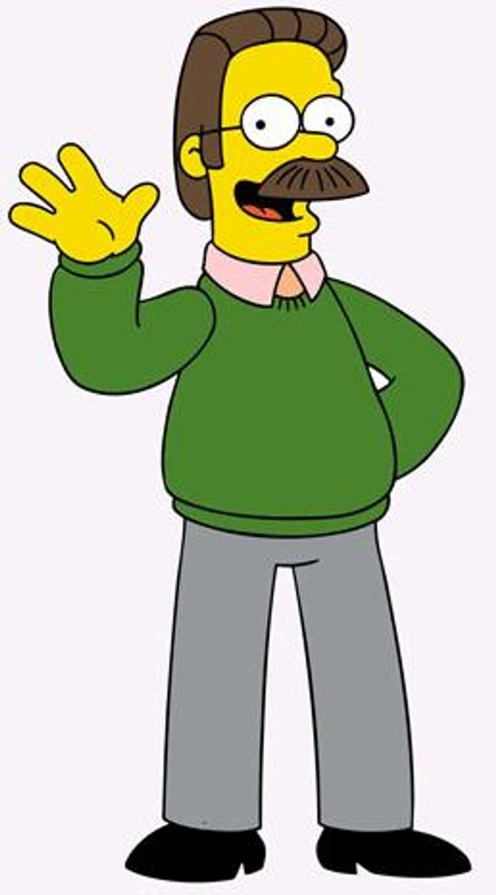 Ned. Ned from the Simpsons is the good Christian neighbor that most people are lucky to have. He can be a bit annoying sometimes, but if you need something, he is always there to help. Like ORU, they are a school that is always there to help and puts students first--even if they make the students walk a thousand miles from the parking lot to classrooms in the rain.