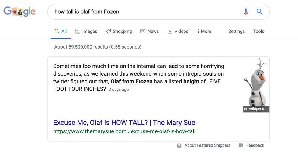 When you search Olaf's height on Google, you are going to find a lot of results like this.