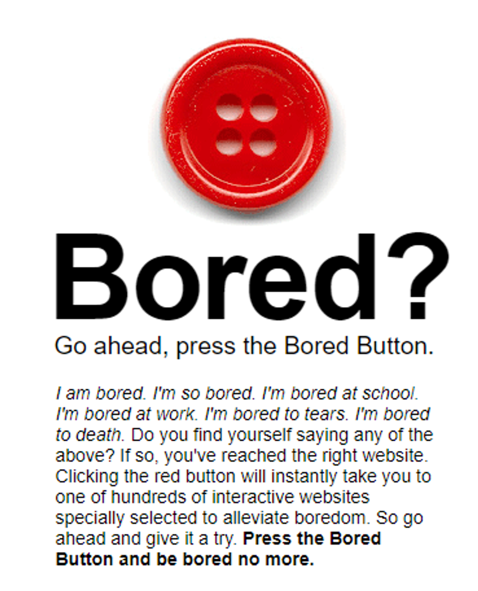 Even with an endless list of computer games at your disposal, boredom was inevitable. That's where the bored button was handy. You'd just click the button and it'd take you to a random webpage or game. If you got bored of that game, you'd simply click the button again! And again... and again.
