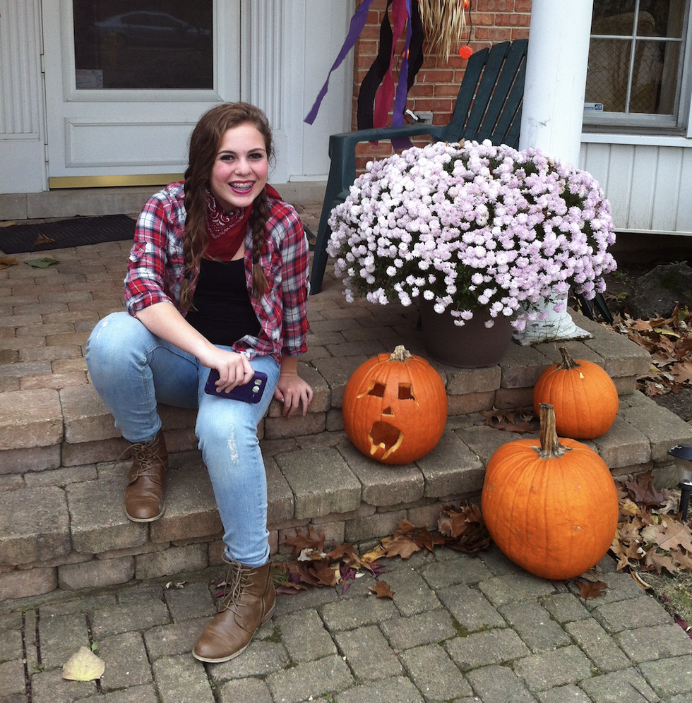 Bright red lipstick, braces, unnecessarily dark eyeshadow, and an Android phone. Not sure what's scarier, me or the pumpkin.