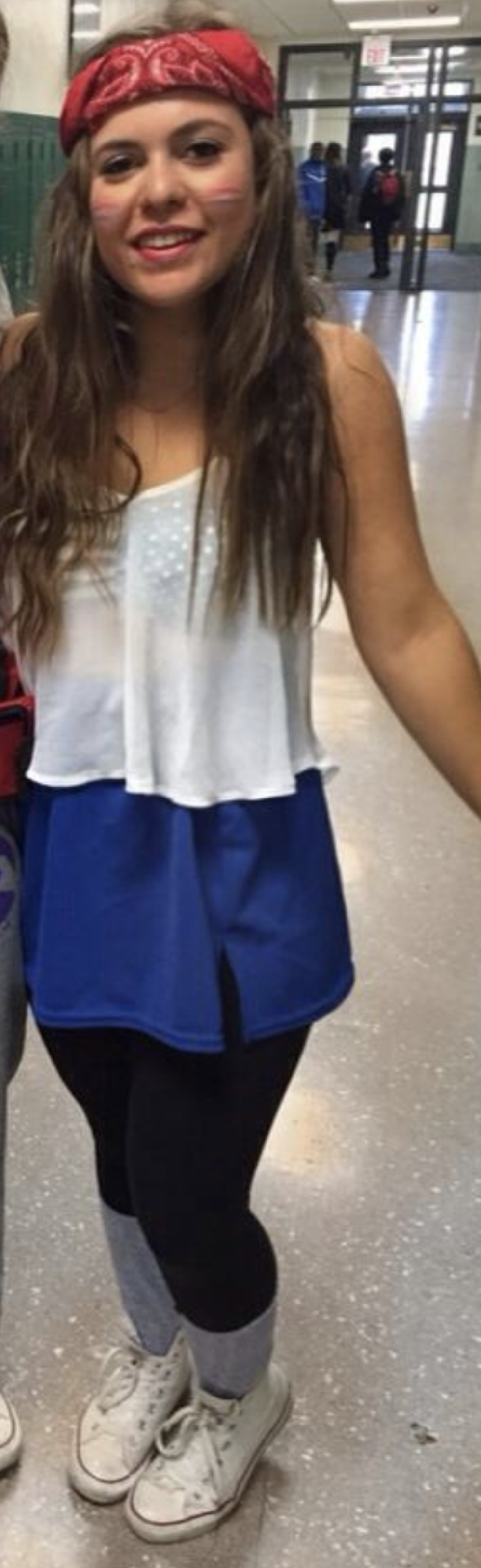 Ah, yes. My friends and I dressed as "USA girls" because we were unoriginal sophomores and had to put something together last minute. Fun fact: I got dress-coded for wearing this because the shirt was see-through, and it showed off my American flag bralette. Sorry but that was the whole point, Mrs. Advisor-Chair.