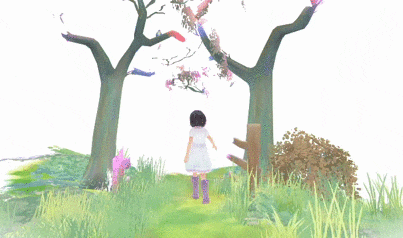 What stands out the most about Rae's story is that the world around her is literally painted before the player's eyes. She always initially stands in a small patch of life among a pure abyss of white. As she takes steps, the everything around her comes to life with vibrant, yet softened, shades of pastel greens, purples and blues. Each step breathes Rae's world into existence, or rather, the world she believes is there.