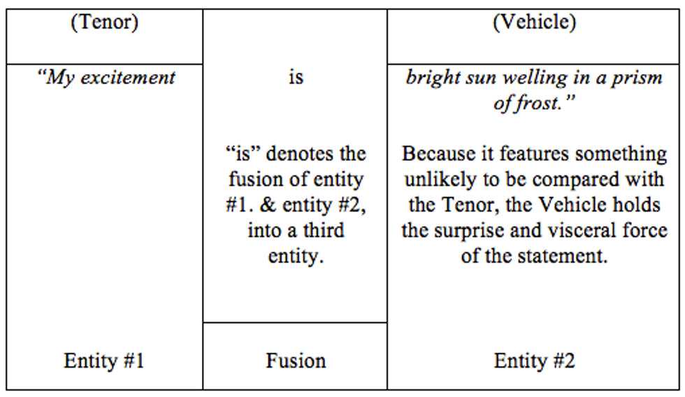 Notice how the metaphor creates a qualitative leap, fusing the speaker’s excitement with the sun’s light (swelled in an ice prism)—Whereas, the simile is merely making a comparison; this is like this, as if to say that while they share similarities, they still remain separate. In a metaphor, the word “is” merges one with the other, avowing or implying that a third entity has formed. This qualitative, entity merging “is” exudes confidence and force, giving metaphors their boldness. But what are the gears and cogs of metaphor; what’s under the hood?