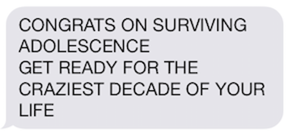 I’ve spent the past couple of weeks saying different ways to hide the fact that I was entering a whole new decade of my life, like: “It’s my 19+1st birthday!” and “In my book, I’m 19 till I’m 21,” and (my friend introduced this one to me) “my anniversary of my 19th birthday.” So, yeah, I was in denial. Because entering into your twenties is a scary thing: college graduation, jobs, living on your own (for real) for the first time, so many real adult things, and just...lots of other really daunting changes that are not all required but still imply pressure. And I know I’m not the only one who fears what the next decade will bring. One of my best friends (who turned 20 last month) sent me a heartwarming birthday message at the stroke of midnight, marking the start of my 20th: