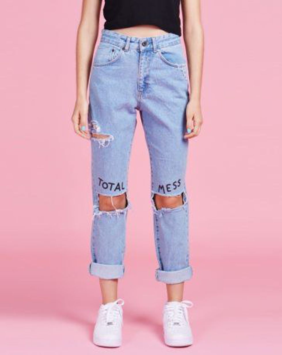 Now this pair has a more 90's grunge feel, and I love them equally much. Of course, being a college student, I identify strongly with the sentiment expressed by the embroidery on the knees. With these, I'd break out the flannel! They're perfect for the fall weather, when it's too chilly to wear shorts, but warm enough that the holes at the knees are much appreciated.