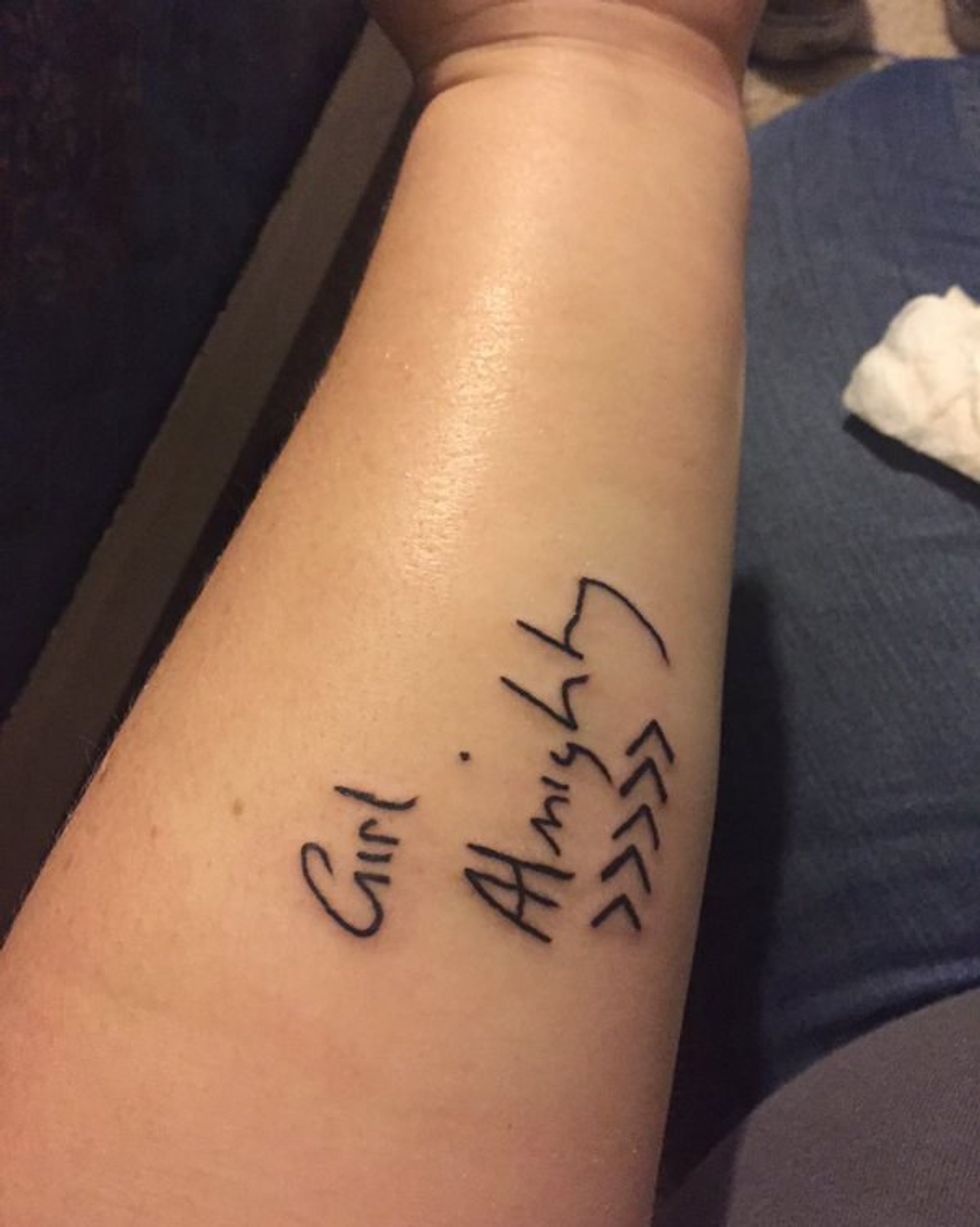 Now, you're probably wondering what does One Direction have to do with this story? Well you see they were my muse, the shoulders I could hypothetically cry on when I needed to. When I felt upset my entire night of doing school work would be to One Direction in the background. When I was listening to their lyrics I felt at peace with myself and I actually felt happy. They mentioned fans that self harm and commit suicide and that they wish that they could've done something to help them from doing that. They mentioned how upset they are that people are that cruel enough to be the reason behind their fans committing suicide. That's when I stopped self harming because I imagined what it would be like if they had come to my house and saw what I was doing. One Direction would be sad and so would I. Since then my love for this band has grown and I know right now they're not together but I still have their music and I still love them very much. October 24th was the day I got my first tattoo and I was going to make it meaningful. Thus, I got "Girl Almighty" with five arrows tattooed on my forearm.