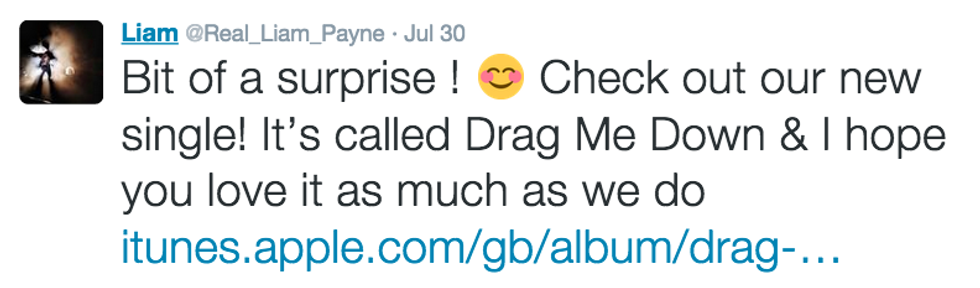 On July 31, at 12:12 a.m. CT, Liam Payne tweeted the iTunes link for "Drag Me Down," completely catching One Direction fans off guard.