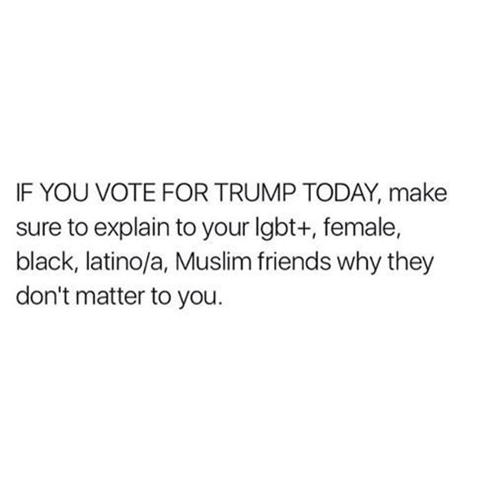 It's time to stop posts like this. It's time to put your feelings aside, accept the next president, and move on. People don't vote based on how it's going to hurt a certain group. We vote based on who we believe will run the country best. So please stop saying if you voted for Trump you voted against certain groups of people because we didn't. We voted for what we thought was best, just like you did. So respect others' opinions. You don't have to like them, but respect them because I respect yours.
