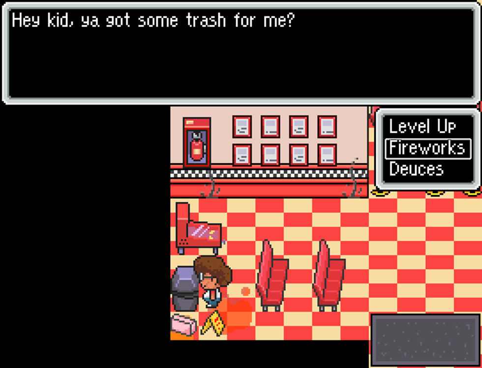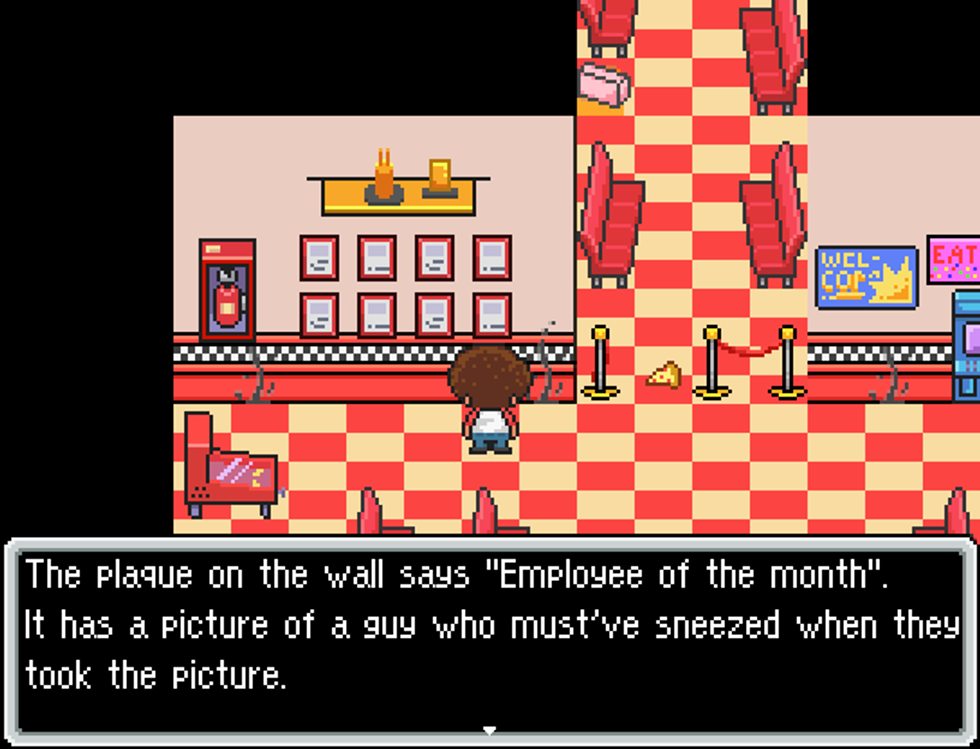 Right off the bat, this game’s visuals exude an aura of Earthbound/Mother 3. Which makes sense, since the creator states the graphics were based on them on the game’s profile. The art style isn’t incredibly detailed, but each asset portrays the right amount of information to the player that it needs to. The pizzeria is very decorated, with tables, plaques, arcade cabinets, mysterious green stains, you know the usual. This makes the tilesets not feel too repetitious, even if they are.