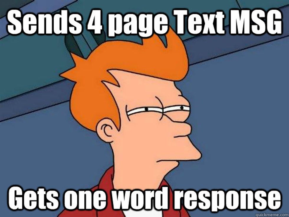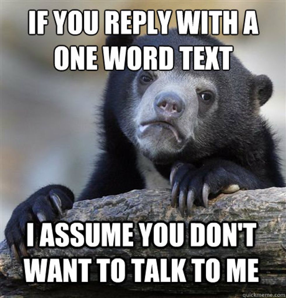 Texting is great. We can text for hours, and even continue a conversation from the day before. We also send each other funny photos and videos whenever we want. But unfortunately, one-word replies suck the fun out of texting. I understand why people send one-word texts when they start or end a conversation, like the typical "Hey" and "Later." If somehow we get to busy to reply something more substantial, then I get why one-word replies come around too. Other than those times, however, one-word texts just grind my gears; sometimes an awkward silence between you and the person you barely know is more acceptable. Here are six reasons why one-word replies are the worst.