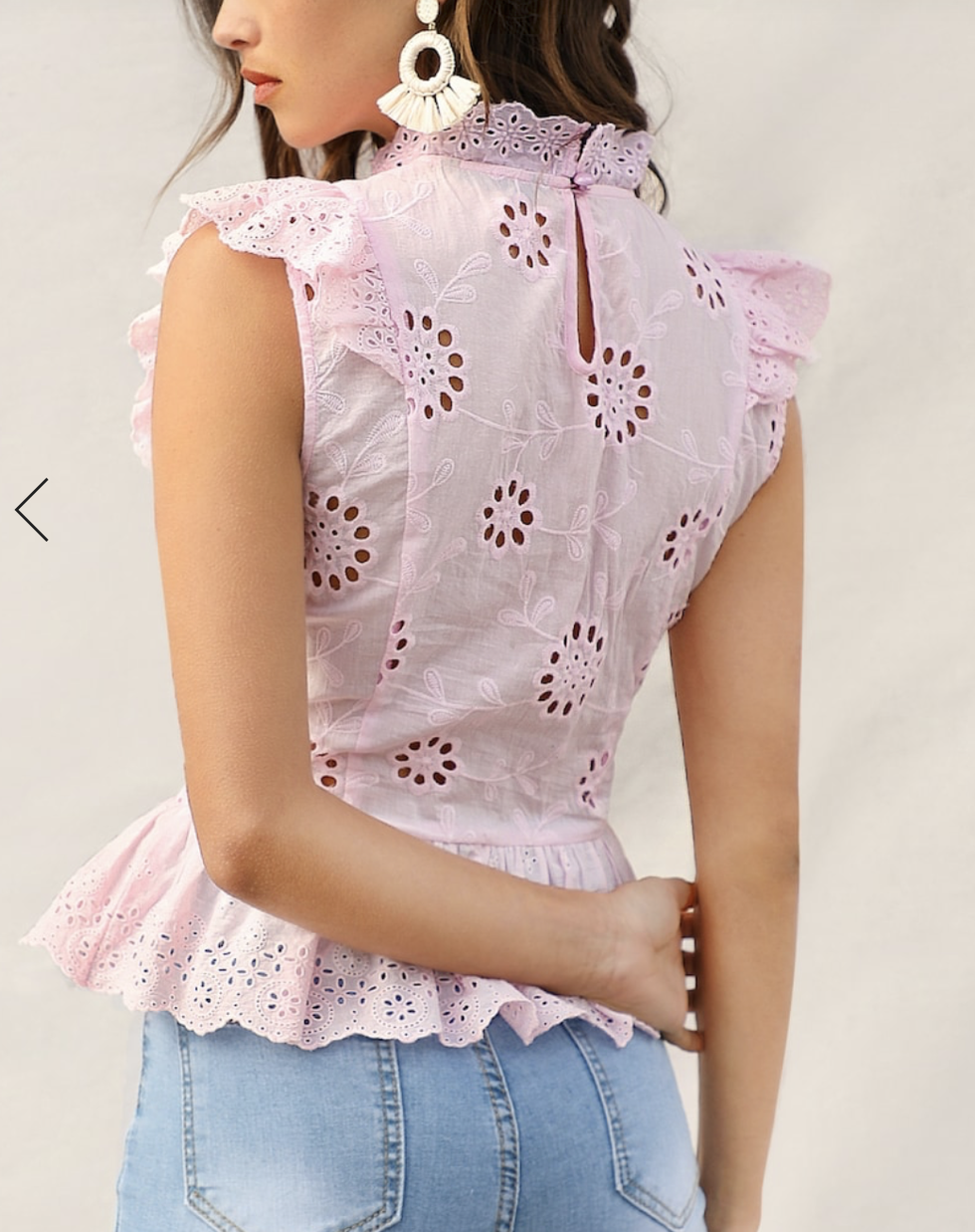Ruffle Trim Eyelet Embroidered Peplum Top in pink