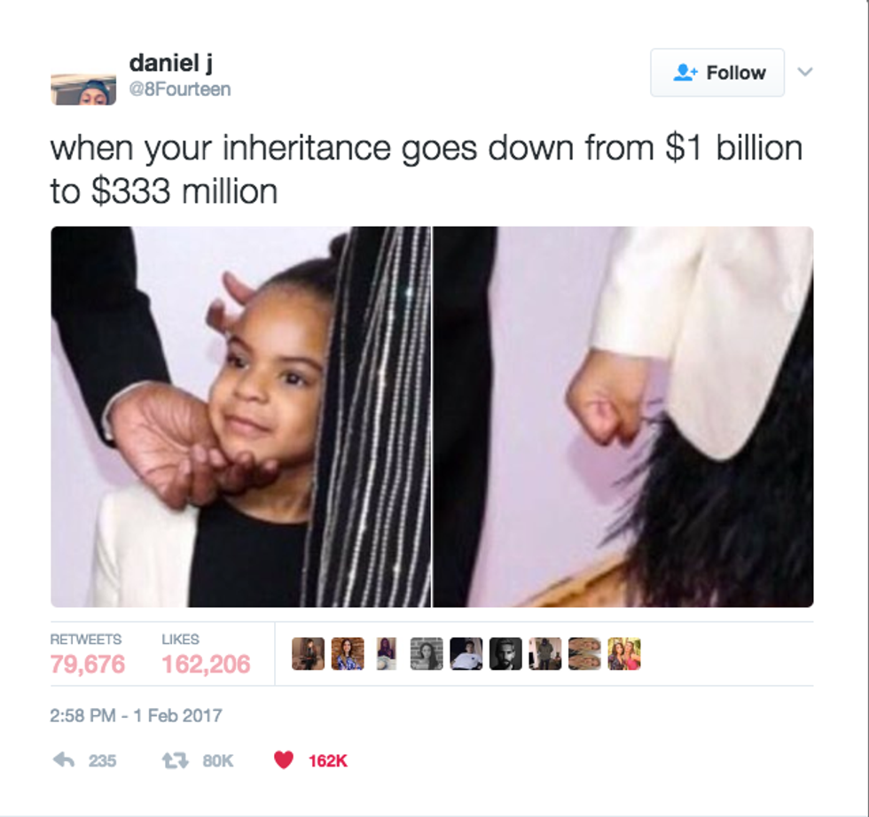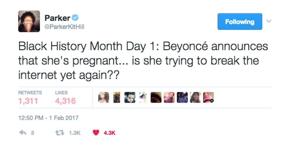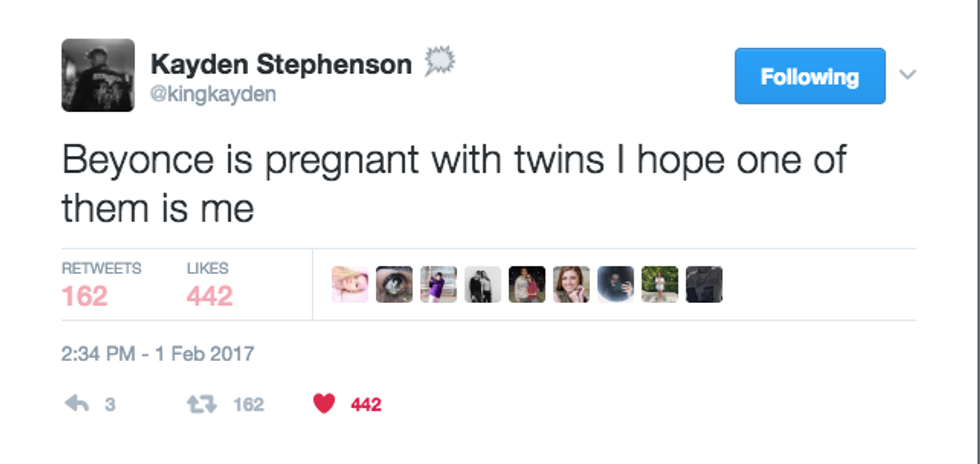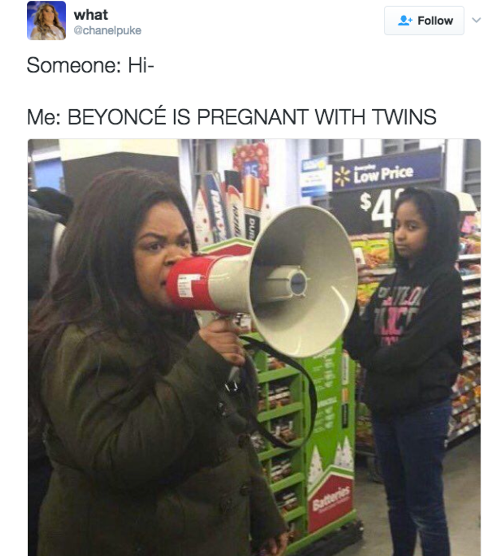 Beyonce -the queen that we all know and love. On February 1, 2017, Queen B revealed that she is expecting twins in a recent Instagram post. Social media exploded and the post surpassed Selena Gomez's record for most likes on a picture. Here is a list of the best reactions that followed the reveal: