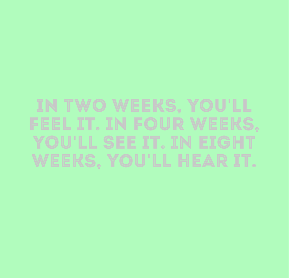 1. In two weeks, you'll feel it. In four weeks, you'll see it. In eight weeks, you'll hear it.