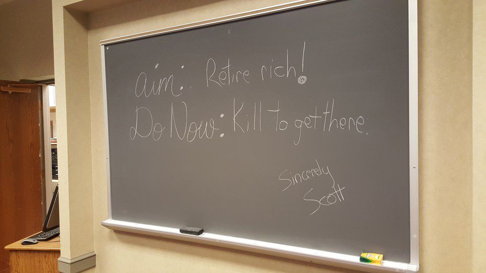 P R O F... F? looks towards class, finishes the E, S S O R. If you take a look at your syllabus, you will see that all of you have failed my class. I don't believe in grades, I believe in an inspiration to learn and a progression in ability. I'm not perfect; there will always be questions I can't answer, things I won't know, but at the same time, I am merely another student in my class, learning from each and every one of you. To teach the world and push them to do whatever they set out for. A professor who incorporates philosophy perhaps? We'll see.