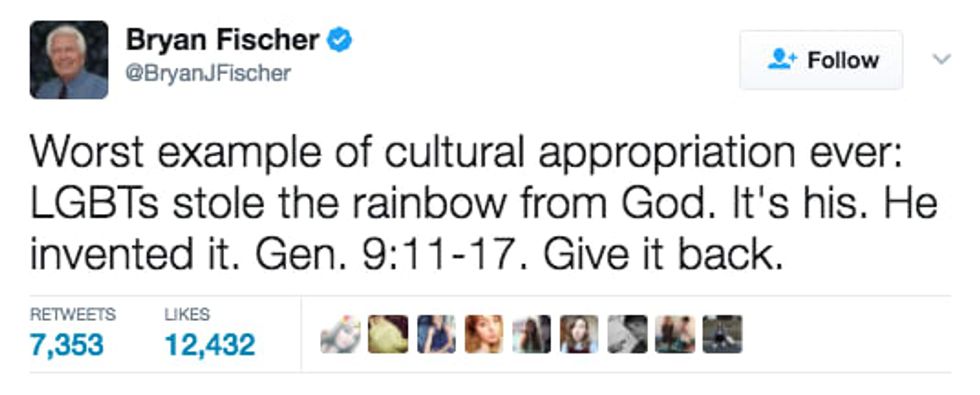 OK, Bryan, I’m going to be straight with you here: I am gay, and I am Catholic (yes, these two things are not mutually exclusive), and I disagree with your assessment that “LGBTs” stole the rainbow from God, or that this qualifies as cultural appropriation.