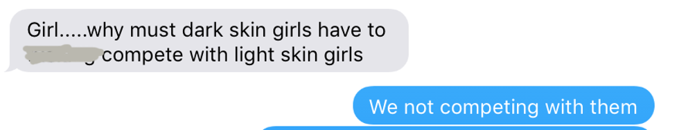 Light skin girls are not our enemies, yes they have privilege but in the eyes of white people, they’re still black. You see how terribly they treat Barrack Obama, and the man is only half black. They’re our sisters, and they still face the issues of being women of color. We shouldn’t hate them because some guy on Twitter said he preferred them over us. We are all queens.