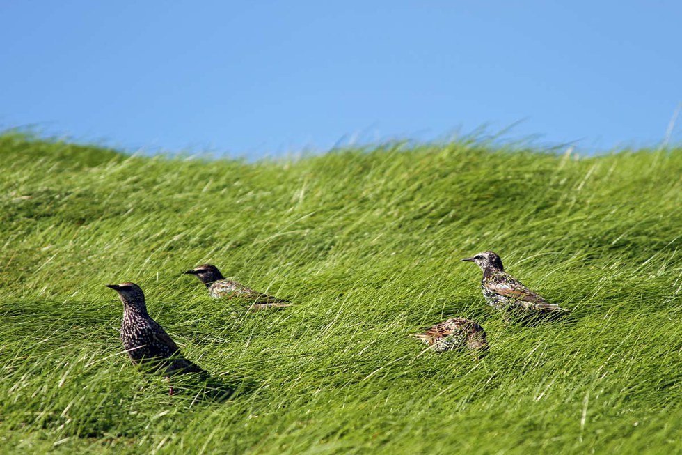 When I open them again, my eyes perceive a sudden movement in the grass. My ears detect the rustling of a hundred tiny wings. Birds spring up out of the sun-dappled grass, perform a ballet-like swirl in the air, and come to rest in a tree in front of me. Two minutes later, they do it again, and again, rising gracefully as one from the tree to land in the grass or another tree nearby.