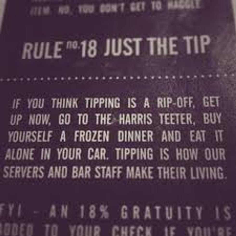 Tip-out or tip share is a concept that most restaurant-goers do not know about. At the end of the night, servers are expected to give a certain amount of their tips back to the restaurant in order to pay the bartenders and the hosts. At most restaurants, it is something like, "15 percent of your tips" or "10 percent of your bar sales," but from talking with multiple servers in multiple different restaurants the most common tip out I've heard is "2 percent of your sales" so if you are not tipping your waiter, they are basically paying for you to eat there.