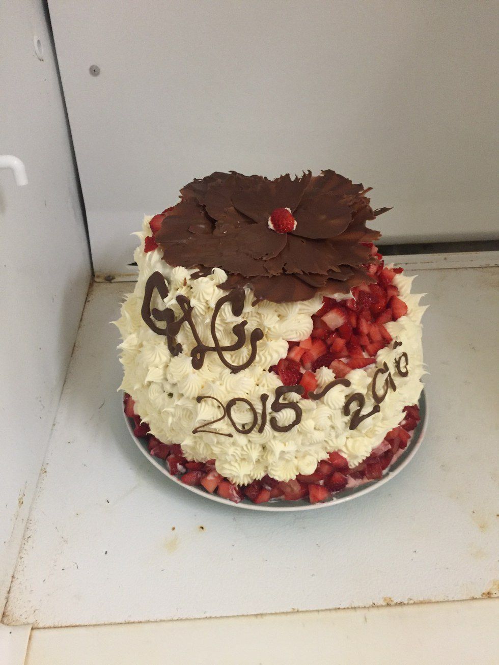 This is a two tiered cake I made. I used an icing tip to cover the whole entire cake with rosettes. (Rosettes are the swirly things. They look like little roses.) After, I stuck some strawberries on the side and used melting chocolate to make the writing and the cake topper.