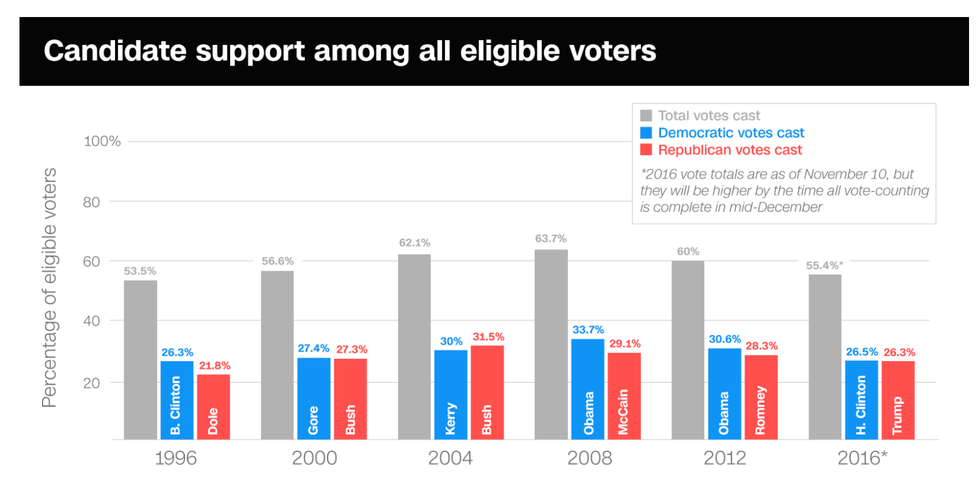 We are blessed to have every. single. citizen. (regardless of the color of their skin/ gender) have the ability to vote and take part in our political process, yet only 55.4% of eligible voters cast a ballot in this election. Let's put this relatable terms: that is a F, as in failure, on a midterm. Granted, voter participation has never really been above D+ range (63.7%), however, with such a monumental election like this one, you would expect more than barely half of all eligible voters to vote.