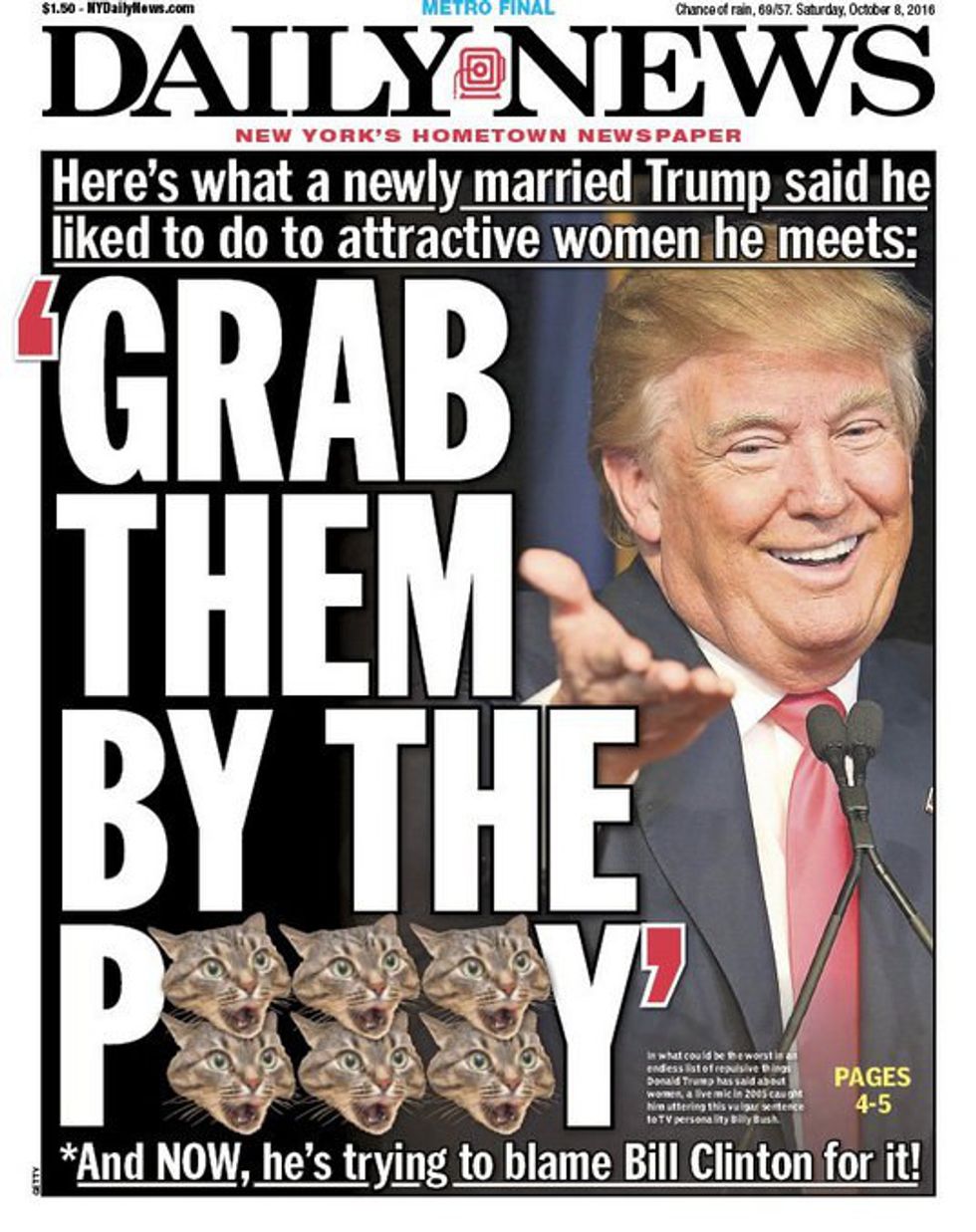Now I’m not saying that Hillary is the best option but at least she isn’t a sexist ignorant man. I don’t like her at all but I’d rather have her then someone who belittles my entire sex just because he feels superior. What really bugs me is that the quote mentioned previously is basically Trump telling males that it’s okay to sexually assault women – to touch them even if they don’t want to be touched. NO THAT IS NOT OK AT ALL. Women are humans too we are not sexual objects or property.
