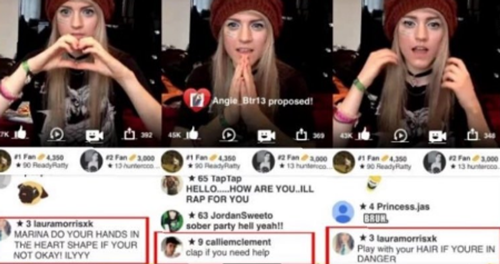 Her audience has said that whenever she has a meet and greet, a bad shooting occurs. So in her videos, when she would say to go to one of her meet and greets, she would use use the sign language for "don't come" as she's saying it. Also, in some of her live broadcasts, her fans would type in things like " make a heart if you're in danger" or "clap if you need help" and she would perform those actions.