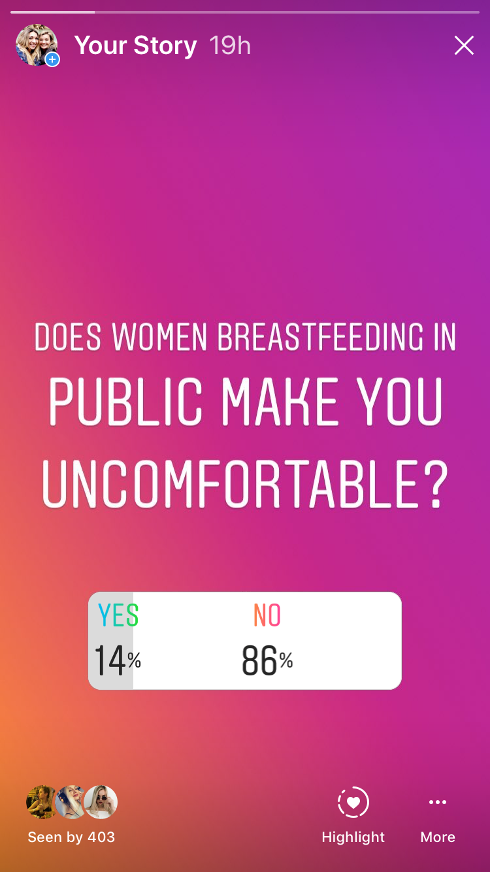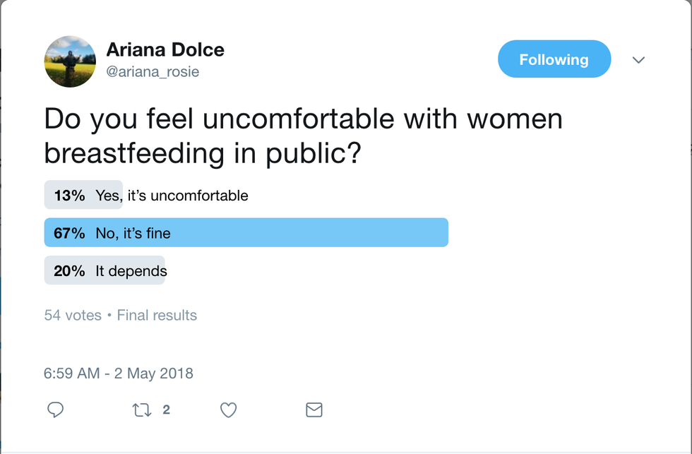 This past week, in my reporting class, I was asked to go create a vox pop (basically comments from the public) about their opinions on women breastfeeding in public, because where I am studying, Salford, England, has a charity called B.O.O.B.S that supports women to be comfortable breastfeeding, even in public settings. As I suspected, the people I talked to all said that it doesn’t bother them at all, but I did receive one response that surprised me. The way in which one woman answered me was (and I’m paraphrasing here) ‘No it doesn’t bother me. I don’t see it as a current problem, and don’t think has been for a while.’ I interpreted this as her having a sort of condescending tone in her voice, as if she was really thinking ‘Why are you asking people about this? Everyone accepts it, who cares?’, but this struck my curiosity, is it really comfortable for everyone? So I tested my theory through Instagram and Twitter polls.