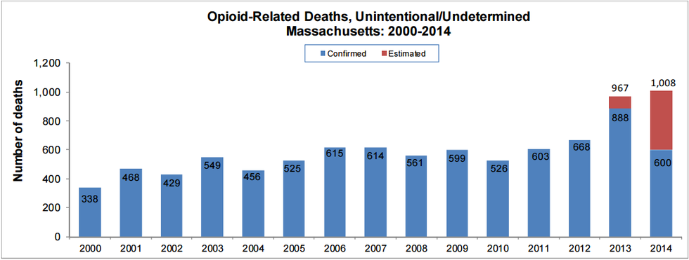 Between 2012-2014, the Massachusetts Department of Public Health recorded that at least one death caused by an opioid overdose occurred in 75 percent of the states' cities and towns.