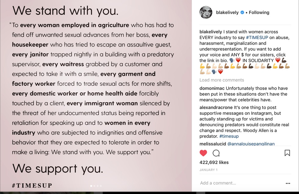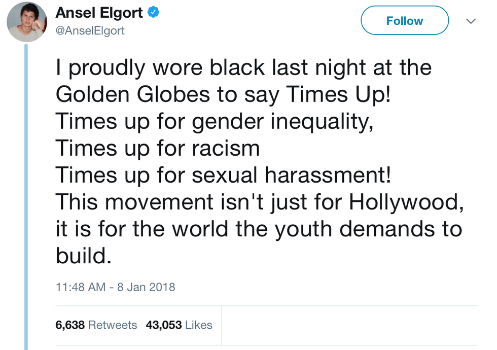 "Time's Up" is a related, more recent movement that started in Hollywood. Actors such as Ansel Elgort, Blake Lively, and more have posted on their social media pages supporting the campaign by saying "time's up" for sexual assault and offering support to victims. If #MeToo's purpose is to raise awareness, "Time's Up" is a way to take action. All of the Golden Globe attendees, men, and women (that I saw) wore black to acknowledge this new movement.
