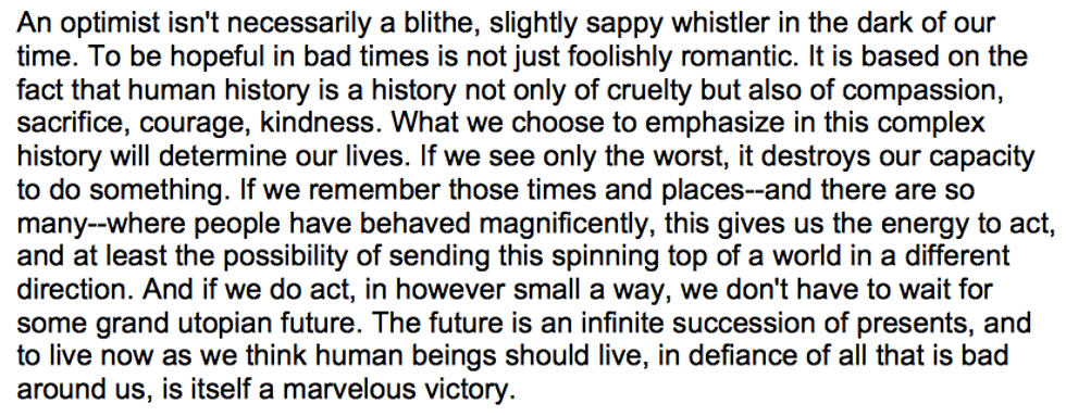 Optimism is something that is constantly referenced in job interviews, personality descriptions, and literature. The other day I came across a passage by Howard Zinn in a piece of literature I was reading for one of my classes; it describes what an optimist really is and provides an interesting take on hope and action in our day-to-day lives.
