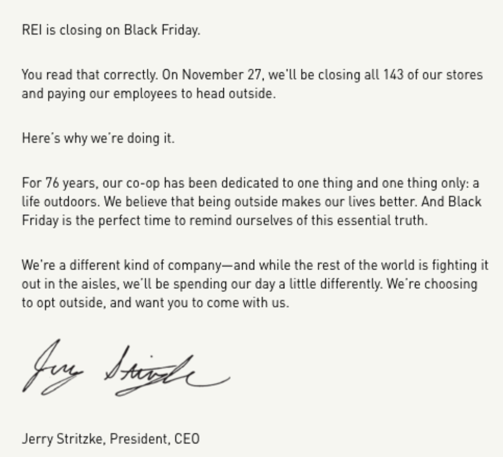 REI has started a social media campaign #OptOutside, and their whole initiative is to get people active and outside. REI's President and CEO, Jerry Stritzke, wrote the following letter: