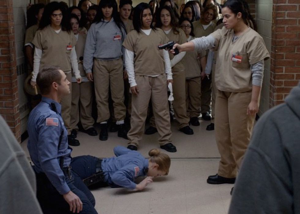 Of all people, the season ends with Dayanara holding a gun towards two guards. Everyone encourages Daya to shoot them both, but the 13 episode long season ends with a memory of Poussey smiling in New York.