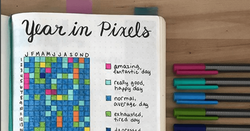 Similar to a year in pixels, you can line color-coated boxes in a side column either weekly or monthly and color them in when you complete each item. If you do it on your monthly calendar, and you want to go to the gym four times a week, line up sixteen boxes to be colored in.