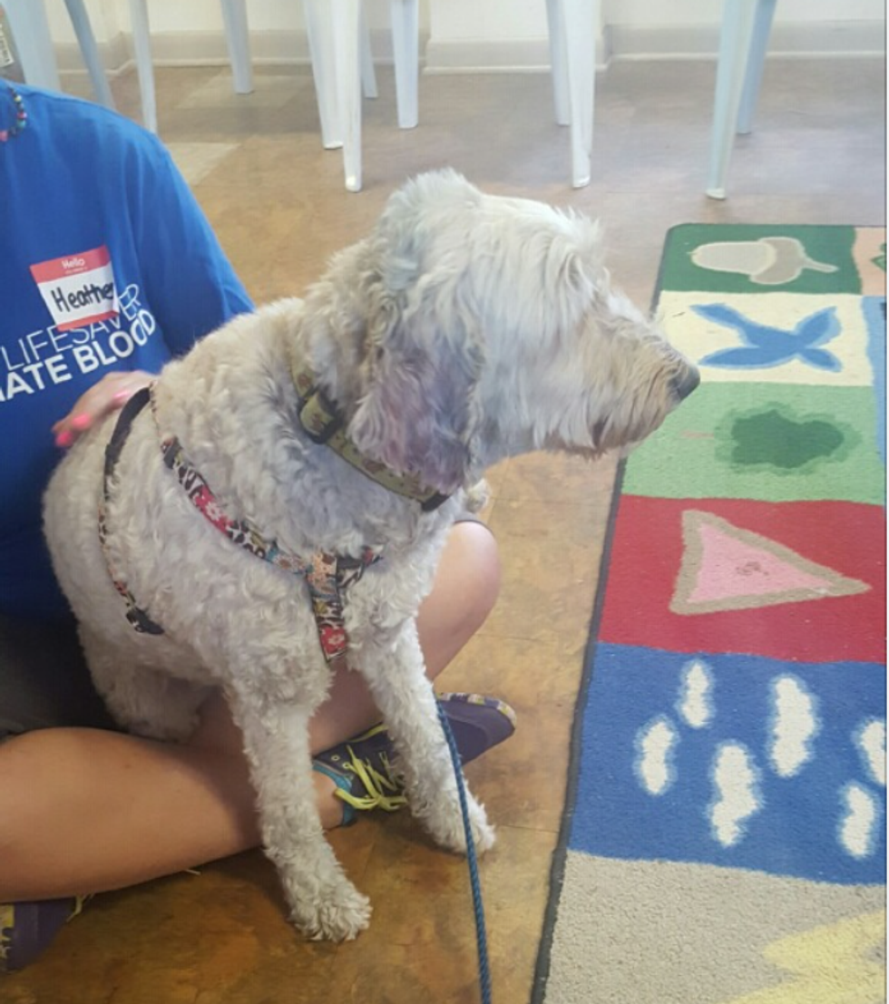 Nalla, an Orlando service dog, doing therapy work at a counseling group where free counseling was being offered to anyone who needed it (@Nalladoodle on instagram)