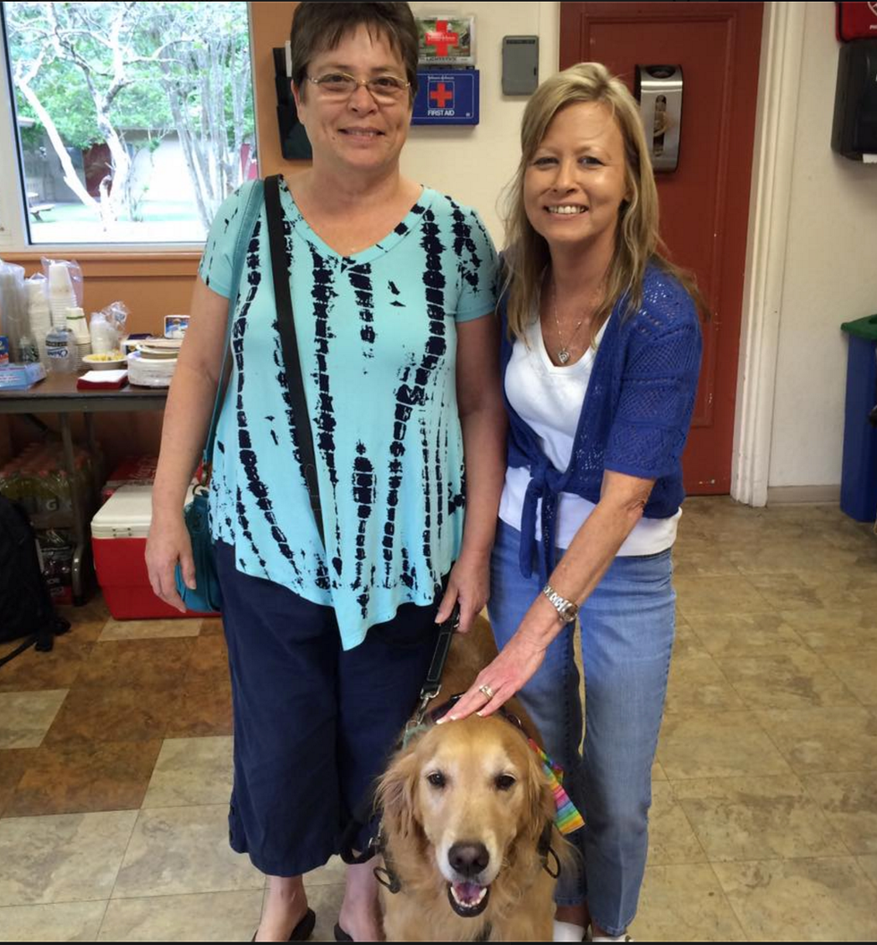 Candice King-Palgut, Kimberly Beck-Frate and therapy dog, Leah, getting ready to volunteer and do anything they can to help