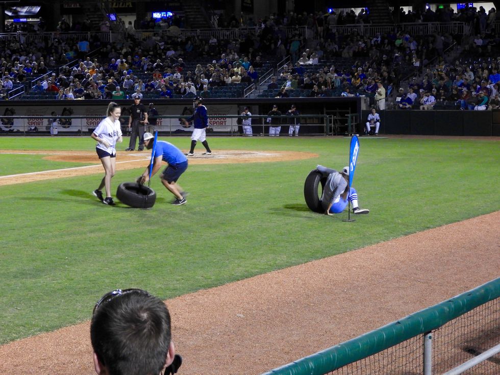 Before the game started, I was chosen to go on the field in between the 2nd and 3rd inning to participate in a tire race. I needed someone to race against so I signed my brother up against his will. When the 2nd inning was nearing an end, I looked at the amount of people that were in the crowd and had a wave of nerves come over me. I mean my brother and I were about to be the center of attention in front of everyone at The Shrine on Airline. Plus, I had to borrow a friend’s shoes because mine weren’t going to cut it. So there I was, standing next to my brother on the 3rd base line with borrowed shoes and a tire. There was no turning back now.