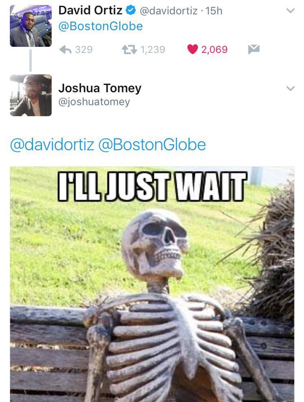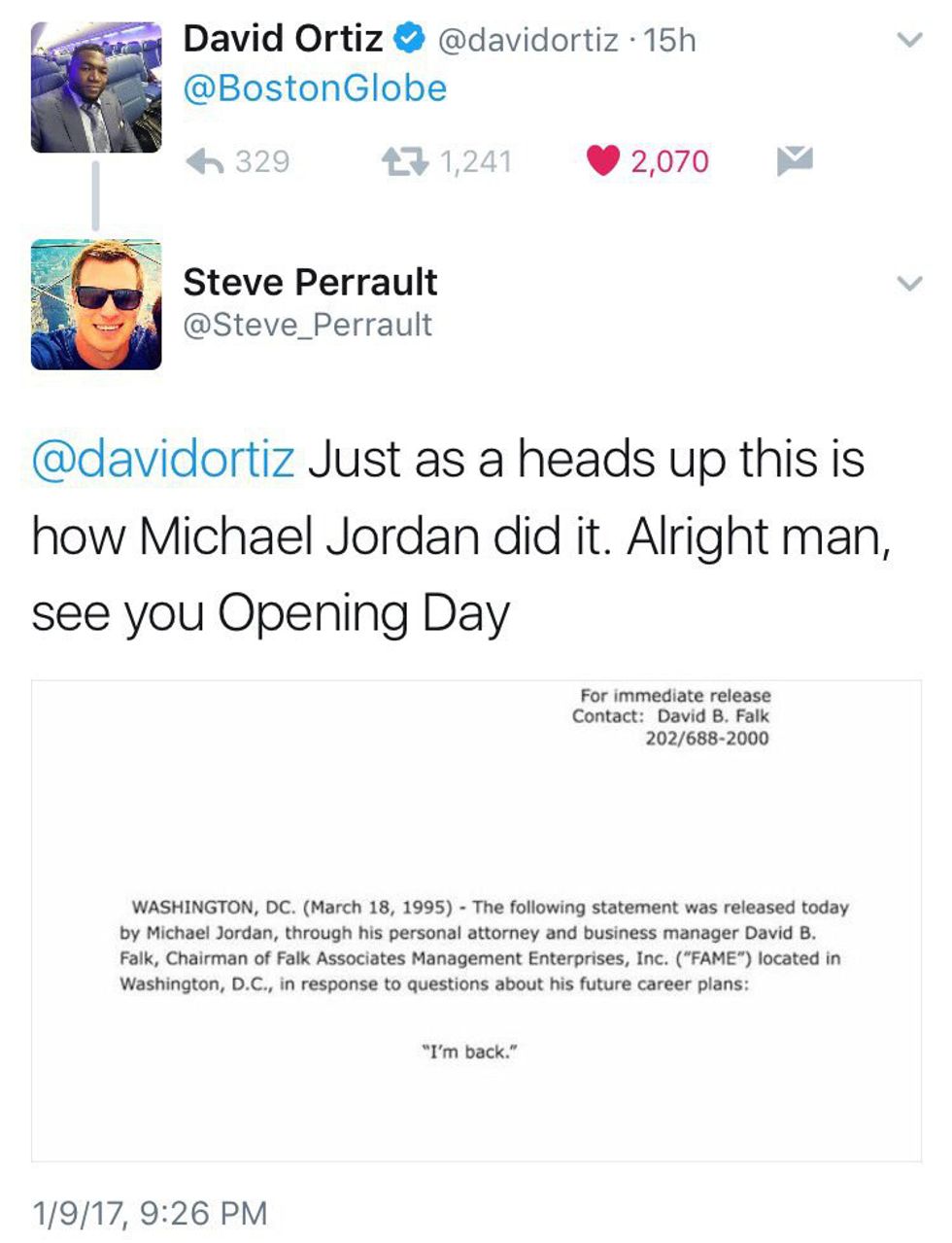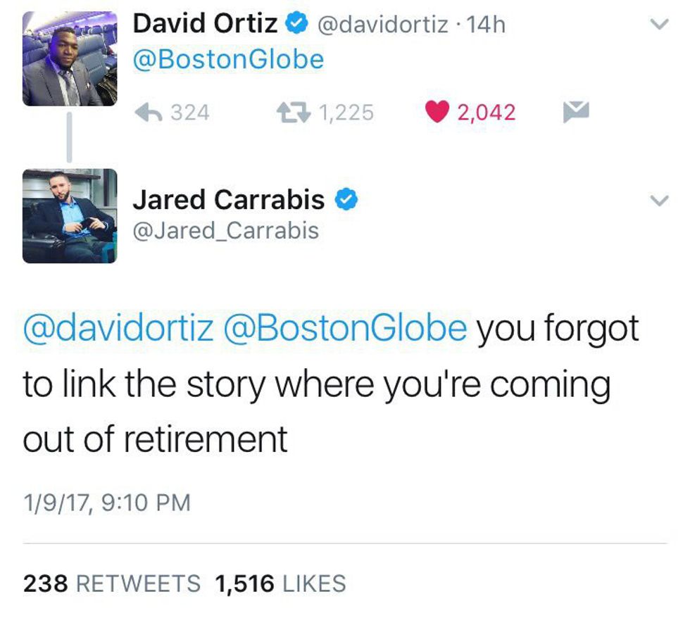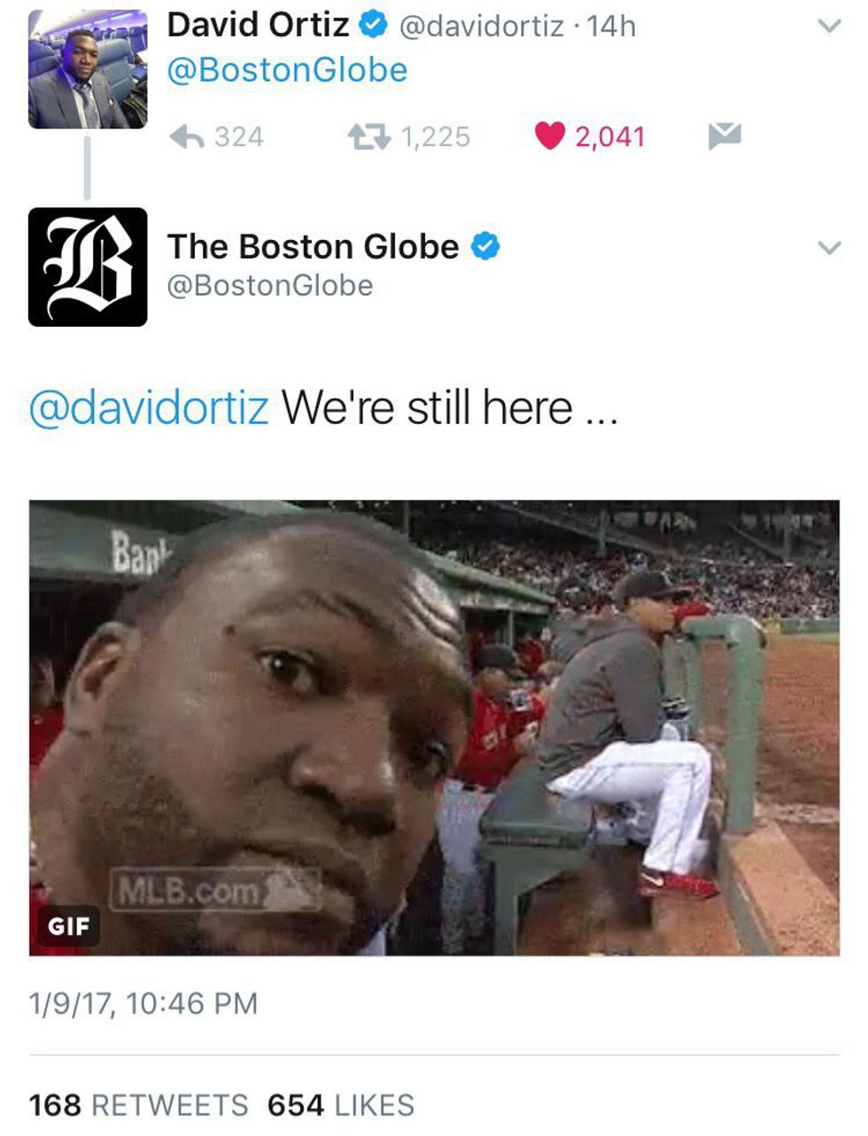 Ortiz plainly said nothing at all, but it was directed toward the Boston Globe. Social media users hyped up the idea of him possibly coming out of retirement. The Boston Globe tweeted the former slugger poking fun at the situation.