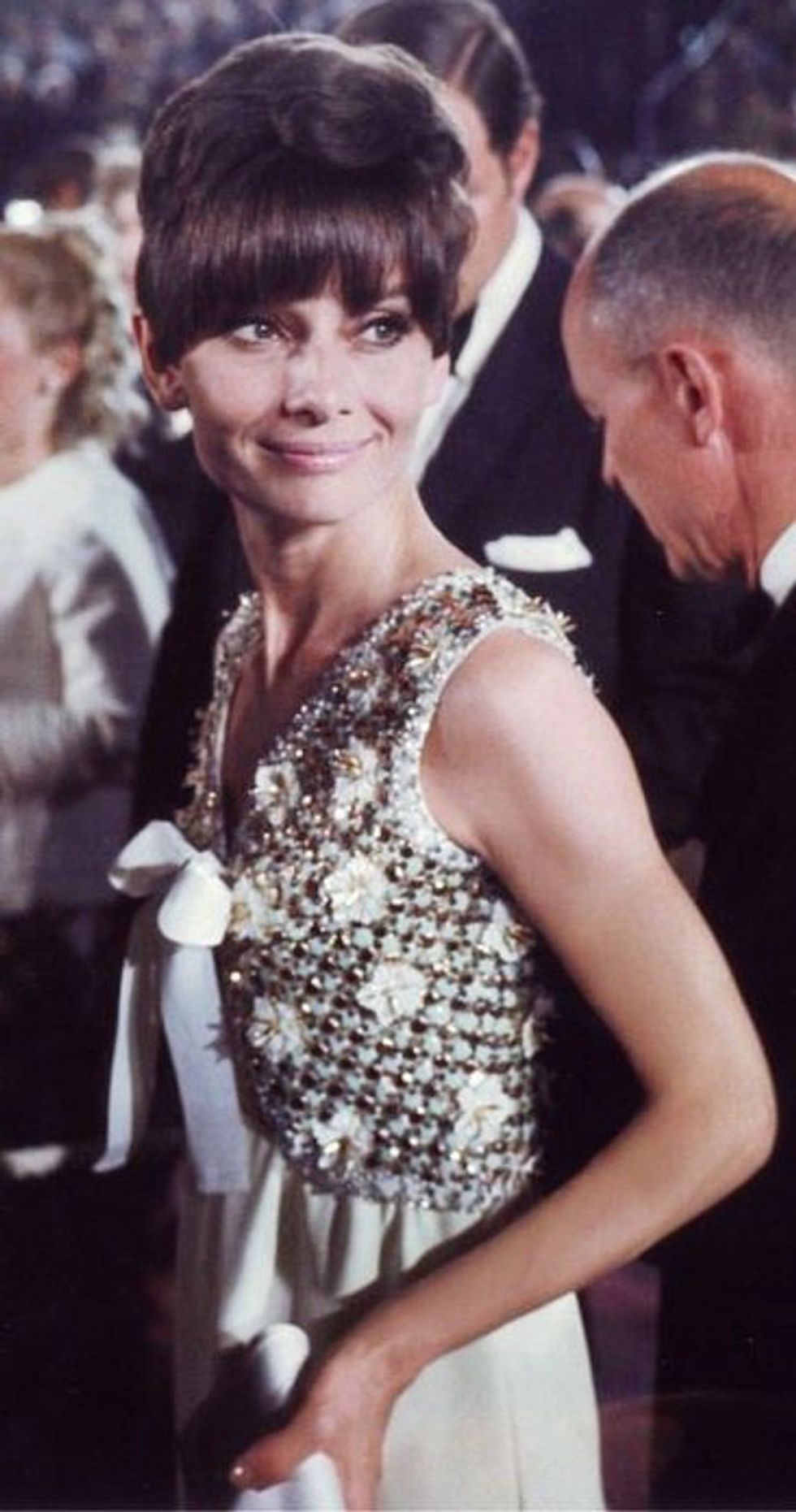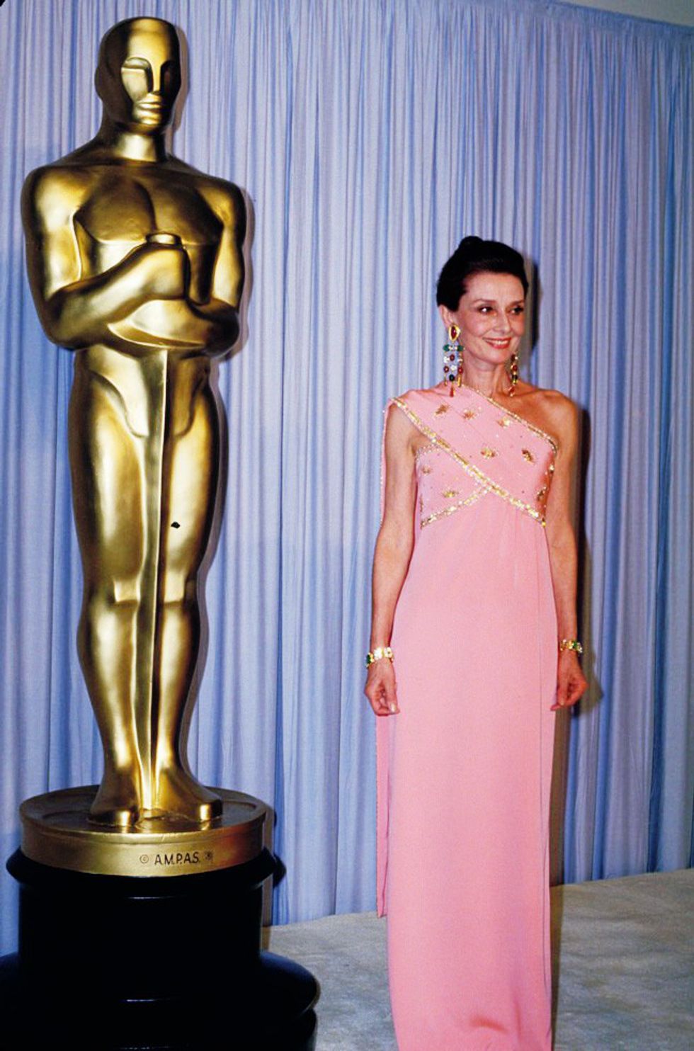 Standing next to the life-size Oscar in 1986, Audrey is astonishing. At the awards, she received a standing ovation while presenting the award for Best Costume Design. Today, I would give her a standing ovation for ‘Best Accessories.’ Her lipstick shade accentuates the crimson jewels in her statement earrings, while the emerald jewels bring worthy attention to her big green eyes. The regal, gold embellishments on the criss-cross top show her as the queen she is.