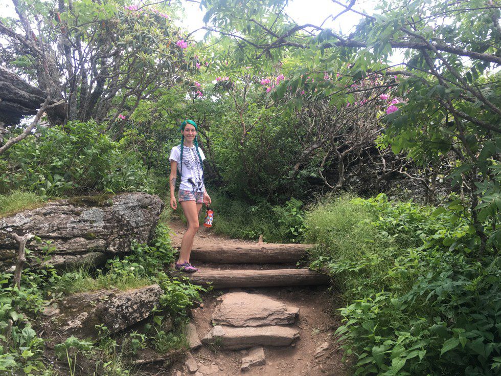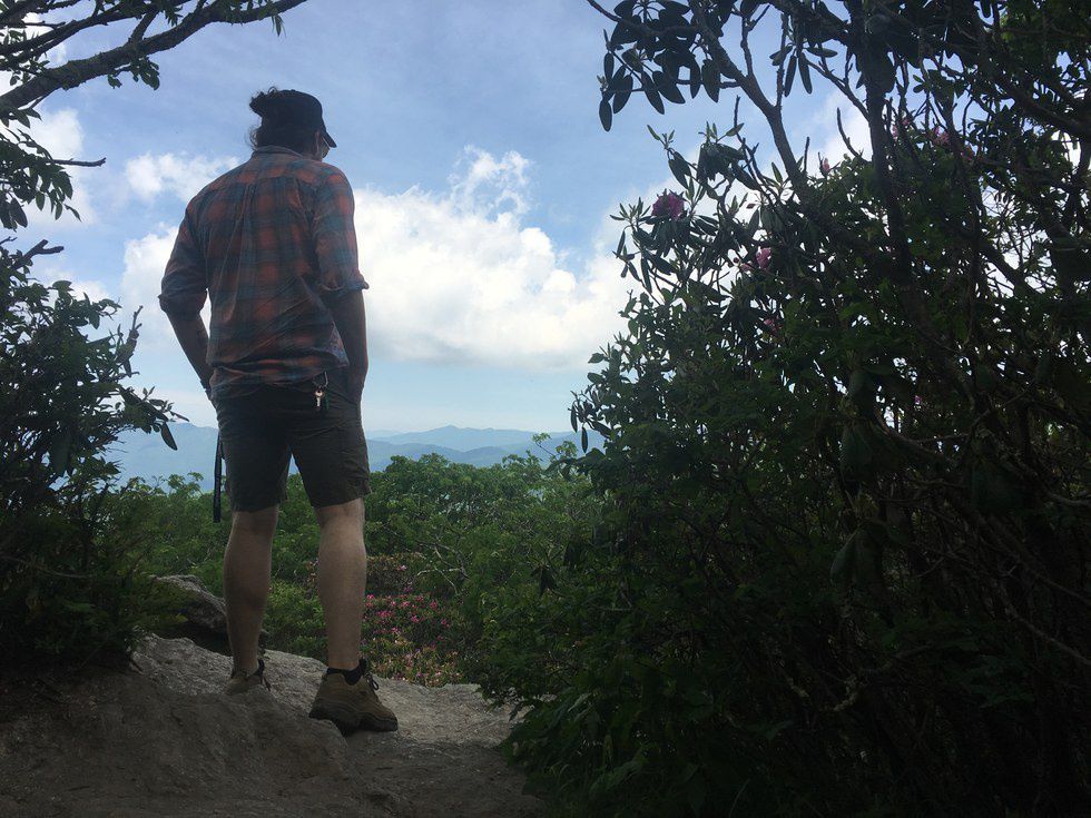 We moved on up the tunnel of rhododendron and dogwood blooms that brightened up the dark green light that broke through into our path. At the top, the trees opened up to reveal a man-made stone lookout platform where several familes stood in picture-taking-with-an-iphone-tourist-pose and one little girl played tour guide and named all the different mountains and structures within sight on the summit. The view was beautiful and we took a moment to take it in before heading back down the trail. Kyle snapped a picture of me as we walked down the path - my grandmomma would tell me that I needed to straighten my back and shoulders so I wont be hunched over when Im older. I made him retake it so that I could put my shoulders back in good posture and send the edited picture to her later.