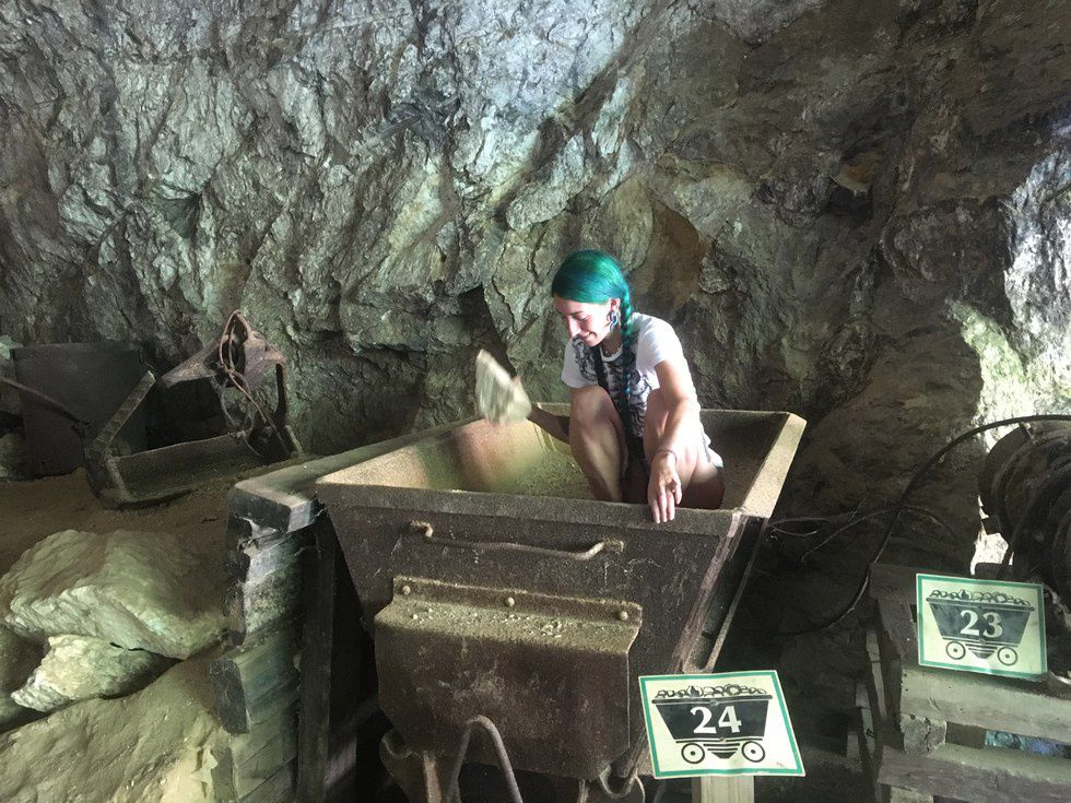 After walking through a small museum of miners lamps through the ages, we walked out into the open air and a small cliff overlooking a pond that dissappeared into the dark wound in the mountain. Lining the walkway down were different types of rail carts used in the mining process - one was called a poop cart.