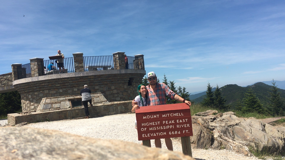 I had never been to Mt. Mitchell - the highest point in North Carolina standing at 6,684 feet tall. Past the sign and up the ridge we went all the way to the very top of the mountain. We parked the car and walked over to a snack bar where we ordered a Root Beer and Orange Fanta to enjoy on our trek up the smooth paved pathway that led to the summit and observation deck. After being tourist-y and taking our picture with the sign via iphone video, we walked back down to a small overlook in the shade that looked off the edge and was framed by deep green spruce trees to finish enjoying our cold mountain top sodas. After stopping at the interprative center to interpret the geology and history of the mountain, we started north once again.