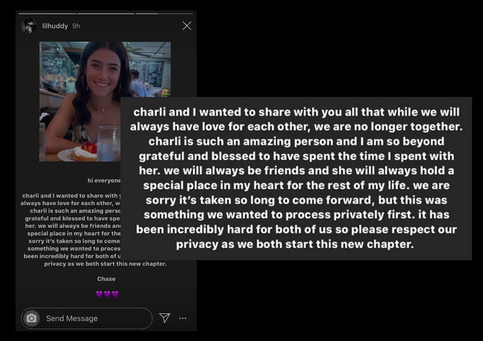 On April 13, 2020, both Charli and Chase went to their instagram to tell their fans that they had officially broken up.